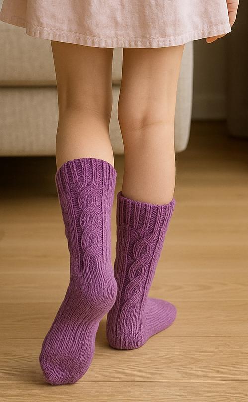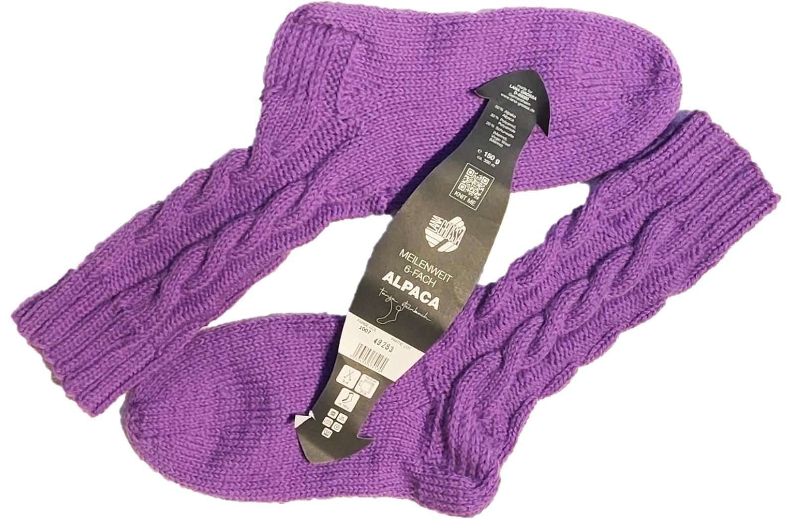 Hand-knitted "ALPACA" wool socks in purple with a cable-knit cuff, sizes 38-39 for men and women. These warm winter socks are made from 6-ply Lana Grossa wool, consisting of 50% alpaca, 30% polyamide, and 20% merino wool. An ideal gift for various occasions or simply to treat your own feet. Please note that slight color variations may occur due to camera settings.