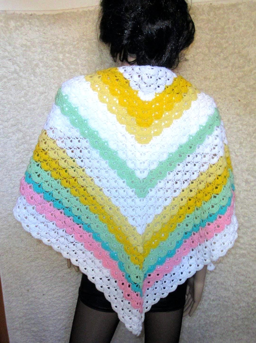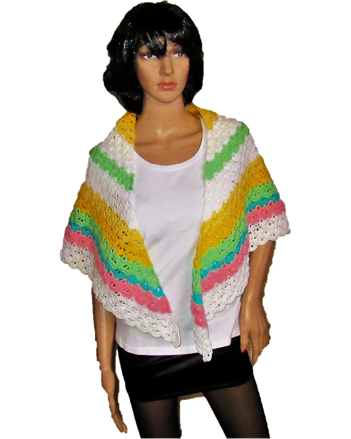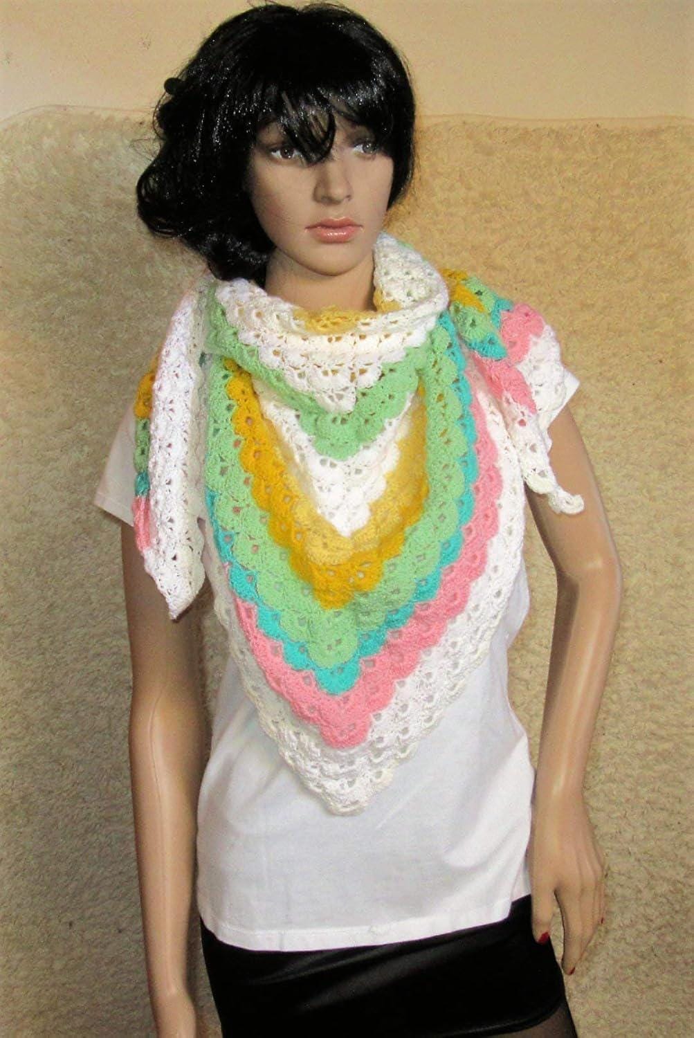 A beautiful hand-crocheted triangular scarf with a shell pattern. Whether worn with a bikini on the beach or on balmy summer evenings, this scarf is a real eye-catcher. Of course, you can also wear it over your head. The longest side measures approximately 150 cm. Material: cotton/acrylic with a beautiful color gradient. Hand wash recommended. Despite our best efforts to ensure flawless image quality, color reproduction may vary due to different screen settings.