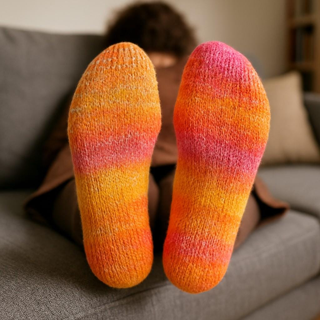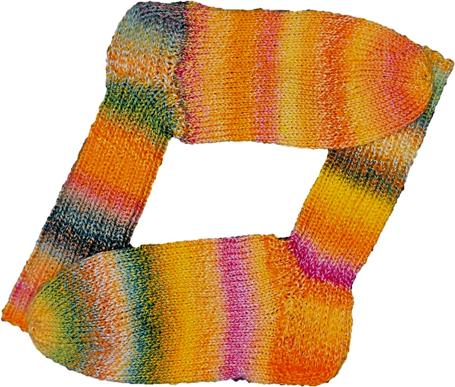 Selling hand-knitted socks made from Schoppel Edition 3 wool. They're ideal as a gift, not just for Easter or birthdays. Of course, you can also treat your own feet with them. The wool is 4-ply and is called "Fool's Gold." Color variations may occur due to camera settings. Size is 36-37.